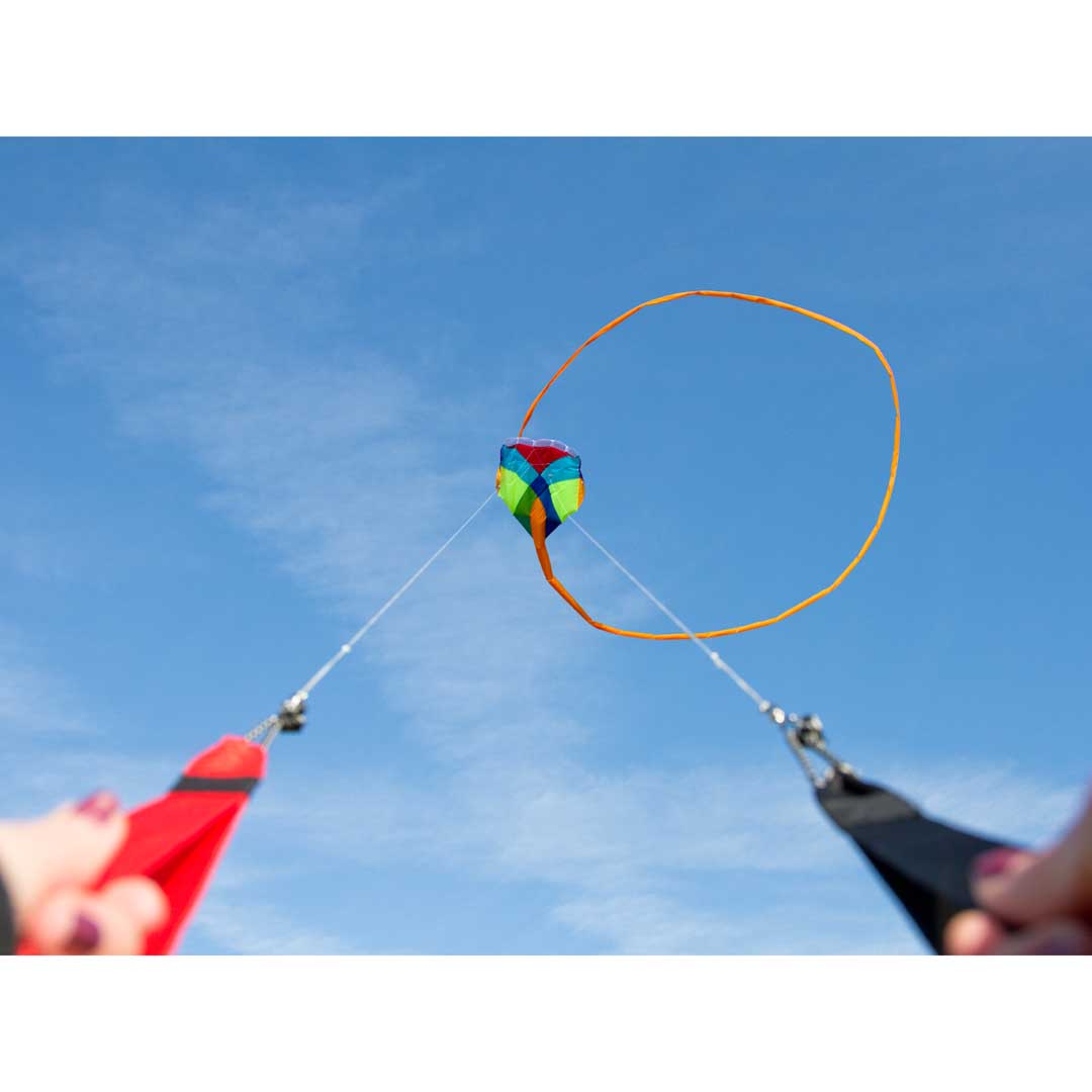 Um den Drachen zum Zweileiner zu konvertieren, wird einfach ein Teil der Leine entfernt, Handgelenkschlaufen werden eingeklinkt und schon kann es losgehen. Der Multi-Kite zieht jetzt nur noch wenig, dabei ist er aber voll manövrierfähig. Kurven, Loopings und Sturzflüge – jede Bewegung wird von dem langen Schlauchschwanz in den Himmel gezeichnet.