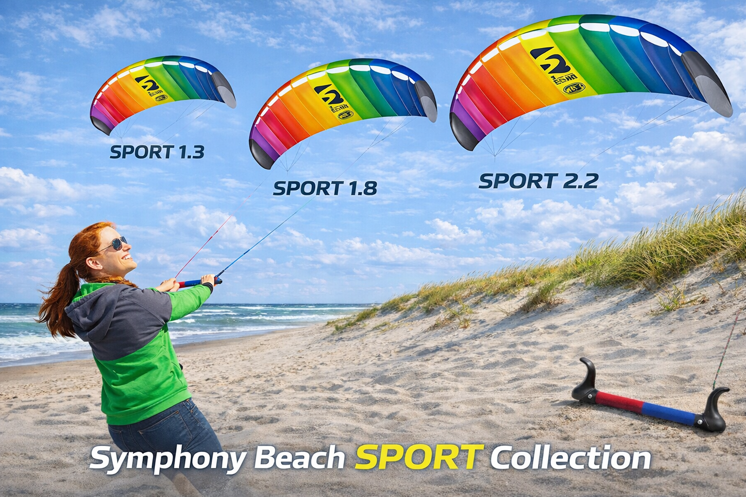 Der Symphony Beach in der SPORT-Version, mit einer Lenkstange, damit jetzt jeder Anfänger seine ersten Schritte mit einem Trainer-Kite machen kann!