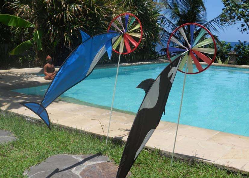 Beliebtes Windspiel in Delfinform. Während sich das Rad im Wind dreht, zeigt der Delfin die Windrichtung an. Ein lustiges Dekorationselement, das zum Glück nicht beißt. Eines unserer ältesten Windspiele.