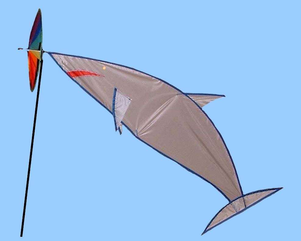 Beliebtes Windspiel in Haifischform. Während sich das Rad im Wind dreht, zeigt der Haifisch die Windrichtung an.