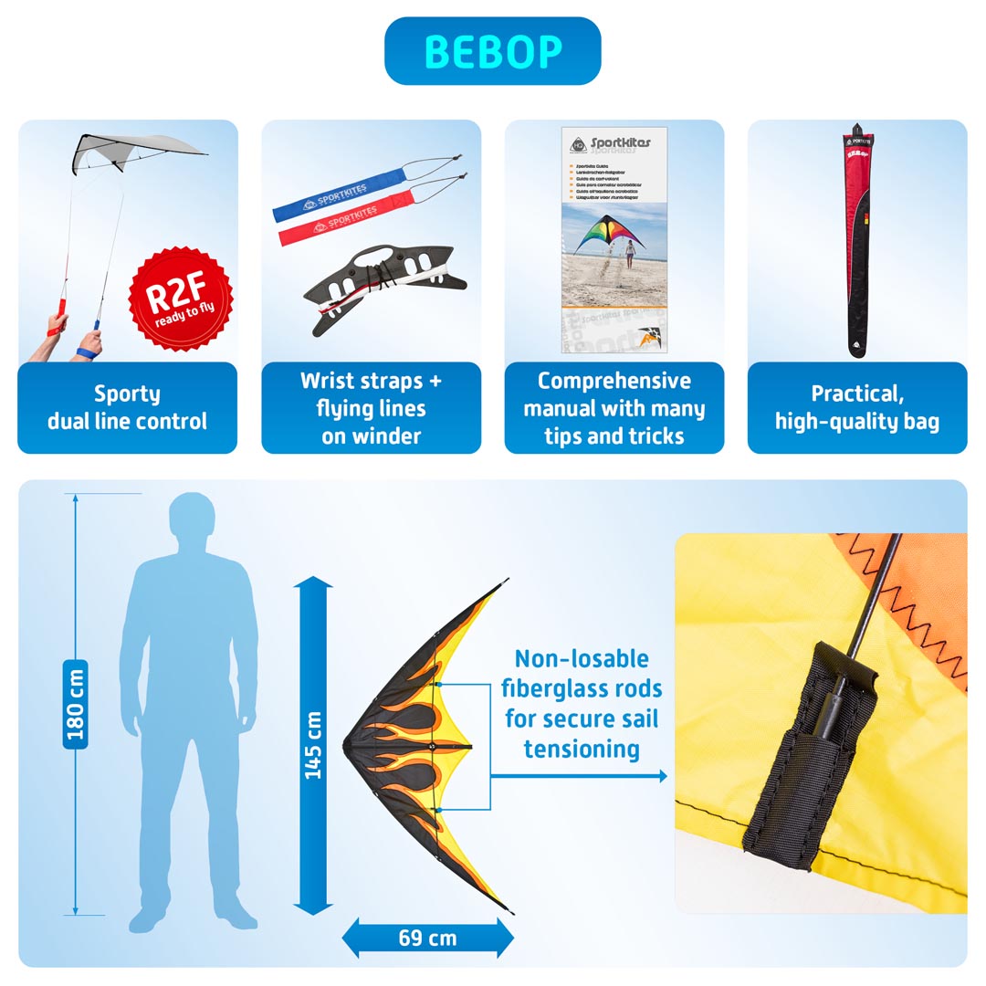 De vlieger vliegt geruisloos en is daarom ideaal voor vliegen op het strand. Met eenvoudige bediening in een breed windvenster en zonder oversturing is de BEBOP een perfecte match voor beginnende vliegeraars.