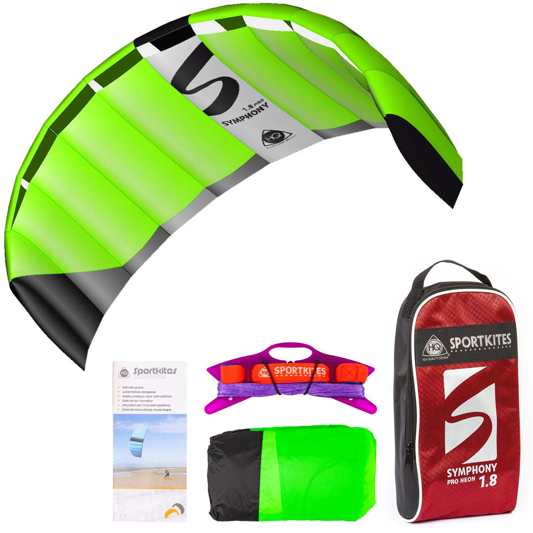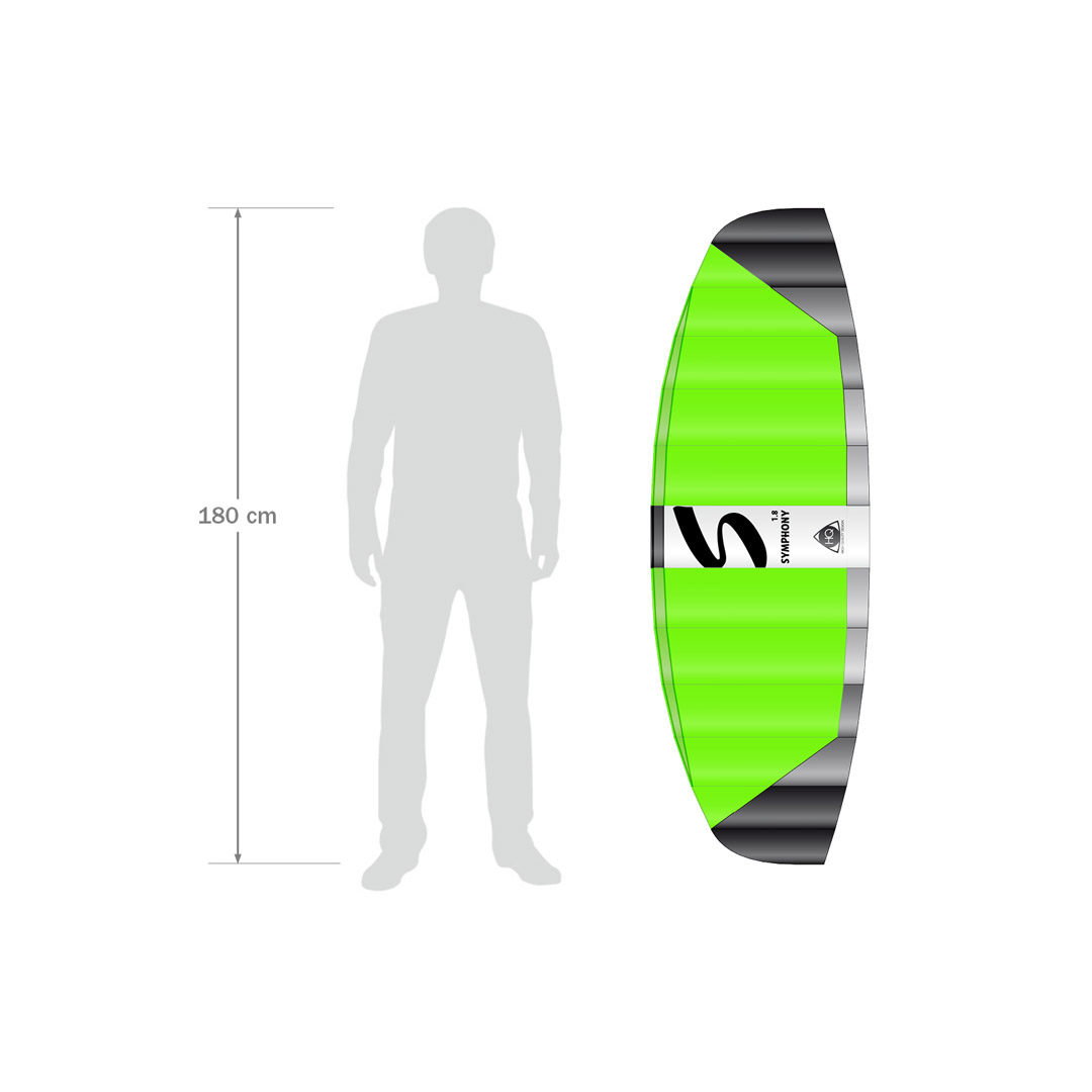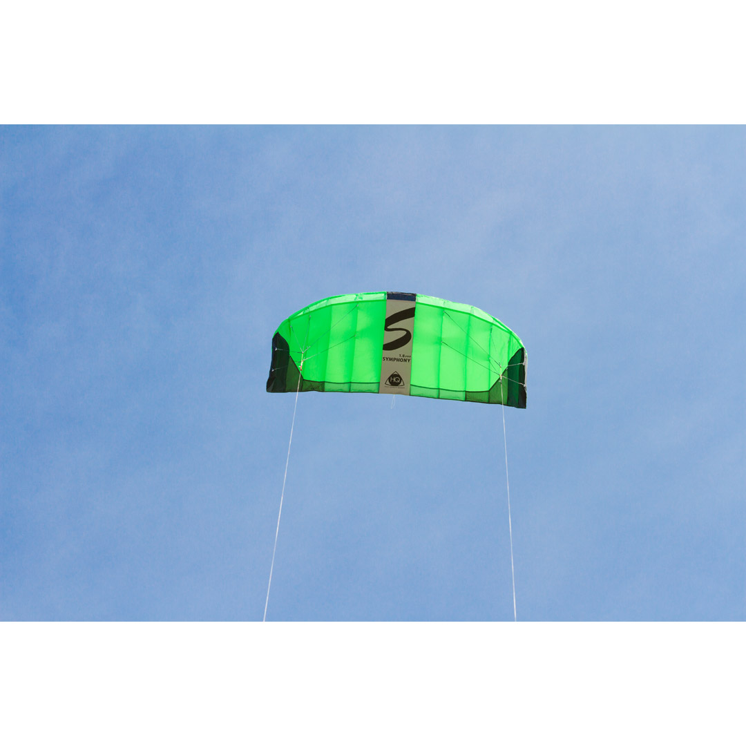 • Symphony PRO 1.8 NeonGreen | 180 x 60 cm. | 1,1m² | R2F | 2x25meter DyneemaLines 100daN | Leeftijd 12+ | Windkracht 2-6 Bft.