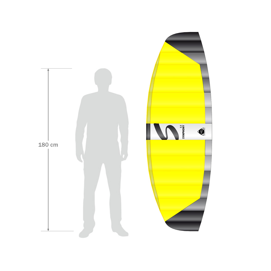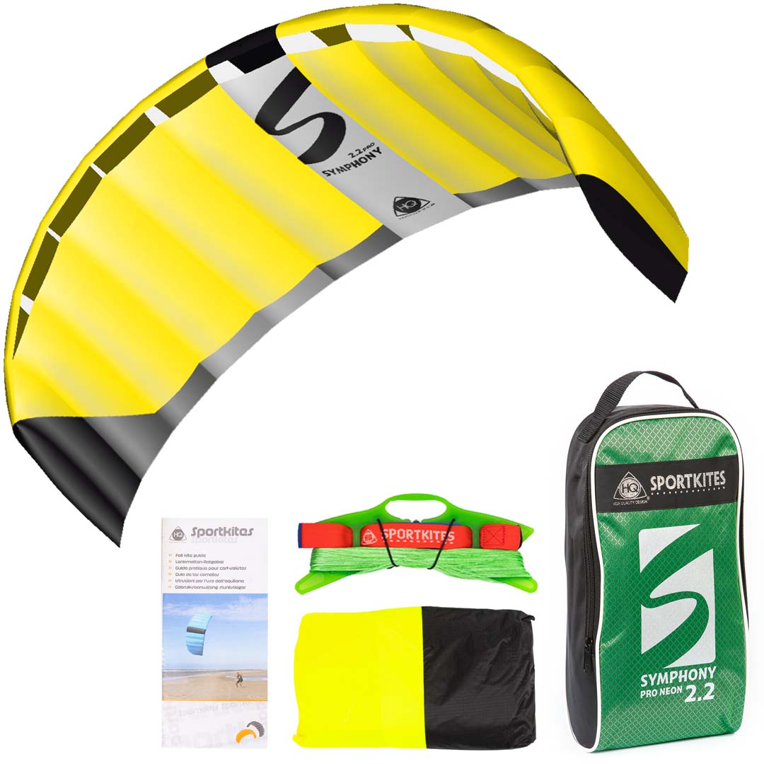 • Symphony PRO 2.2 NeonYellow | 220 x 73 cm. | 1,6m² | R2F | 2x25meter DyneemaLines 140daN | Leeftijd 14+ | Windkracht 2-6 Bft.